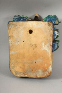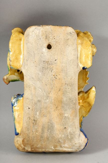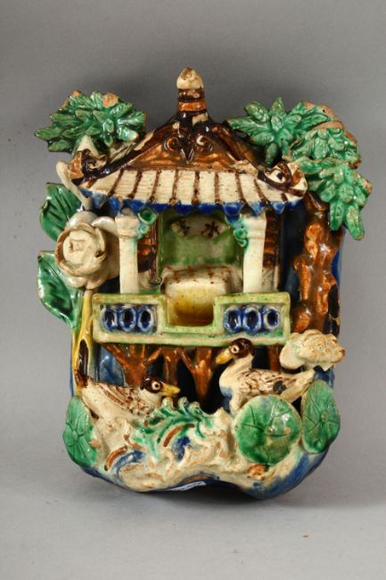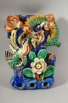 TWO CHINESE POLYCHROME POTTERY WALL POCKETS, carved with a shrine and flora with ducks / birds, 20cm , the other of a dragon.