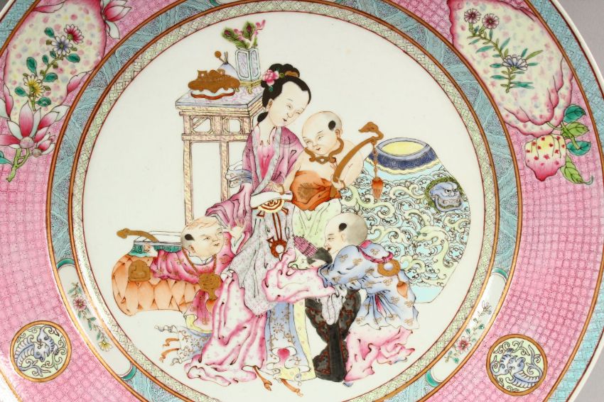A VERY GOOD CHINESE REPUBLIC CIRCULAR DISH, the side with nets of flowers, the centre painted with a female figure and attendants, 35cm diameter.