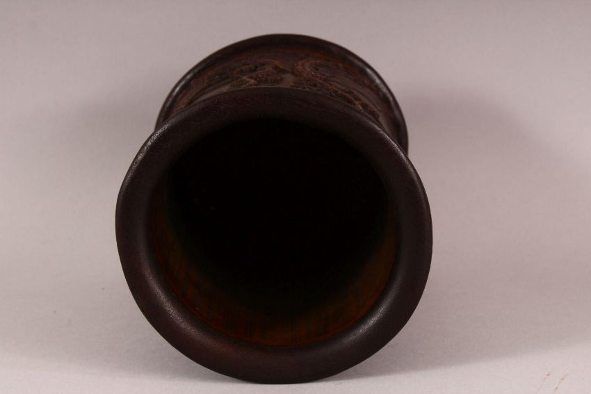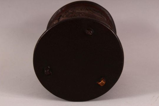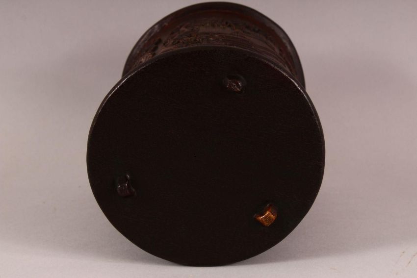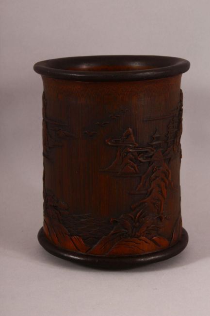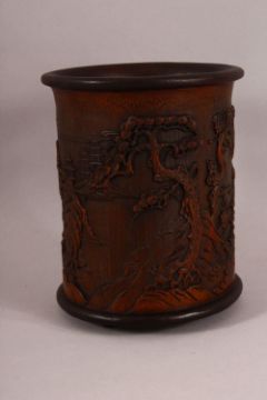 A CHINESE BAMBOO CARVED BRUSH POT - decorated with village landscape scenes, 15cm diameter