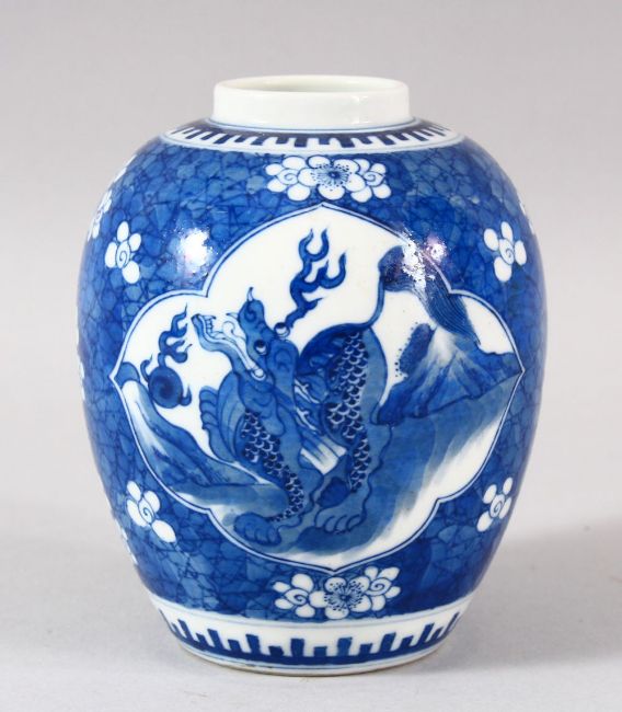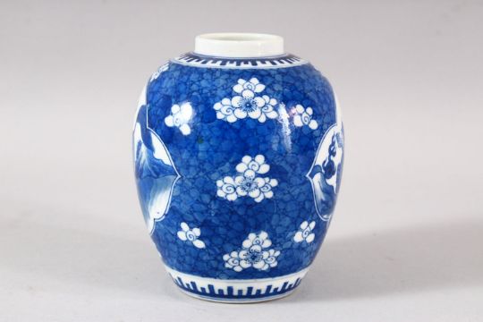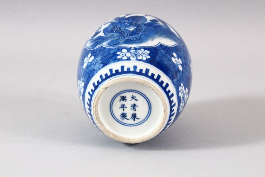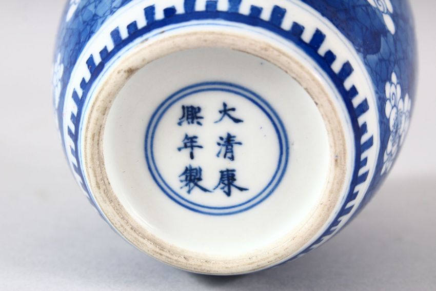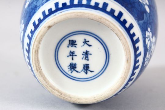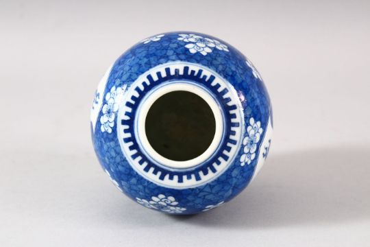 A SMALL CHINESE BLUE AND WHITE PORCELAIN JAR, possibly lacking cover, six character mark to base, 11cm high.
