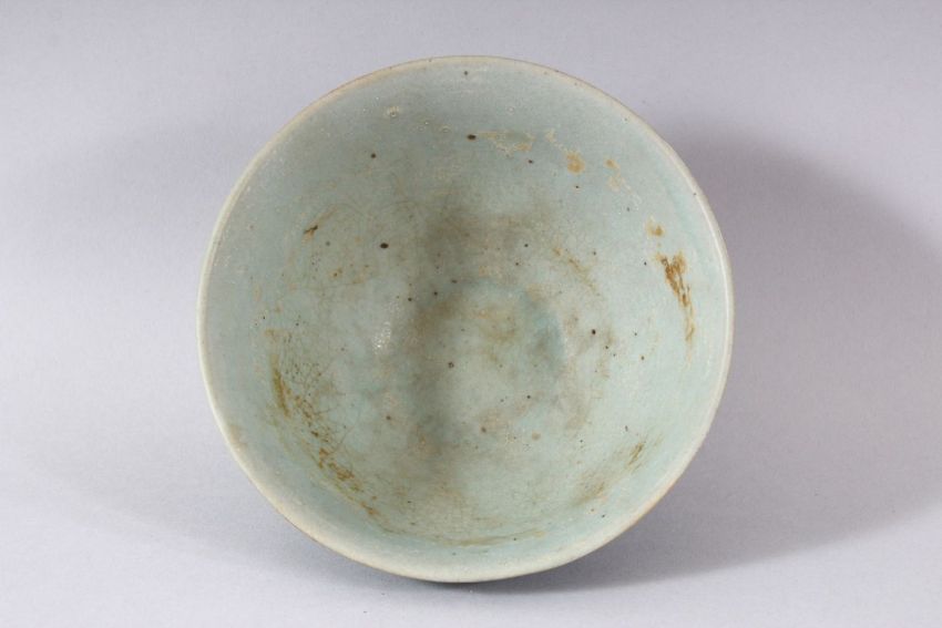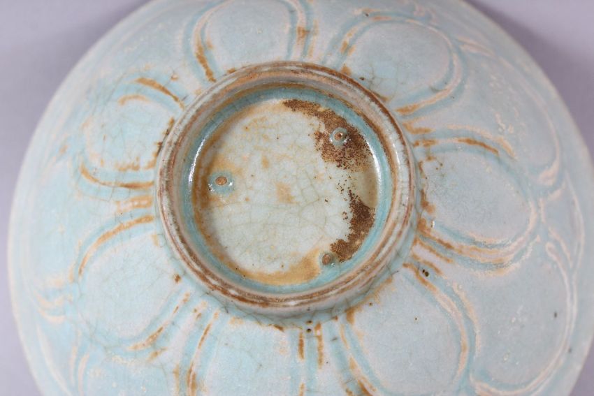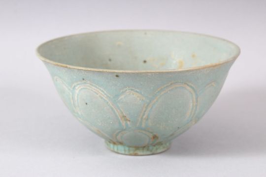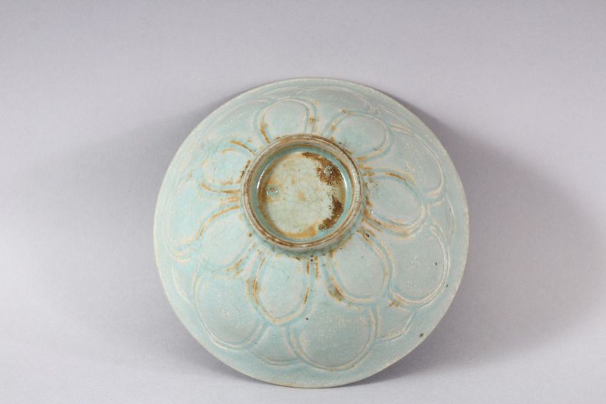 A CHINESE CELADON BOWL, POSSIBLY 19TH CENTURY, with moulded petal decoration, 14.5cm diameter.