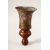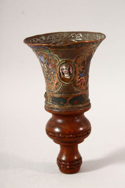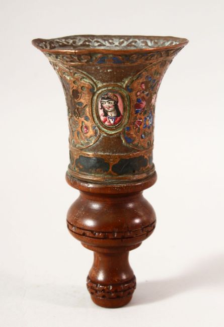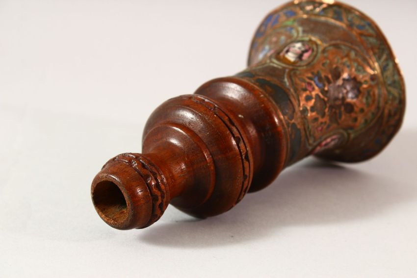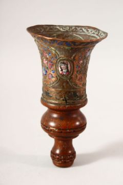 A PERSIAN QAJAR ENAMEL, BRASS AND WOOD HUQQA PIECE, 16CM