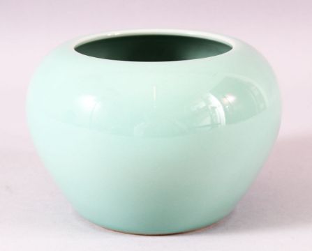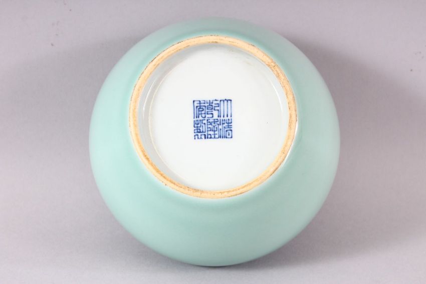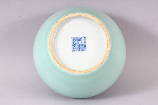 A GOOD CHINESE CELADON GLAZED VASE, the base with blue six character mark, 9.5cm high.