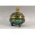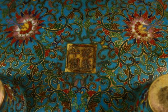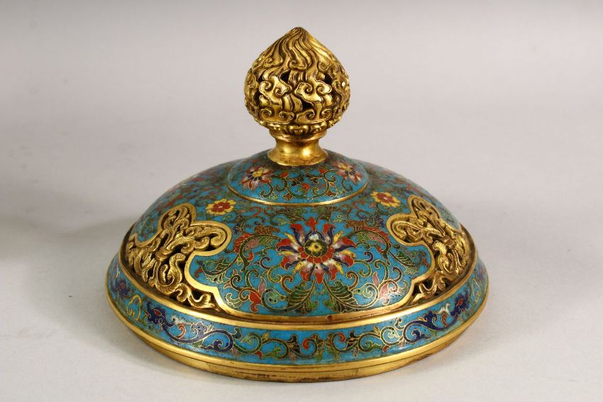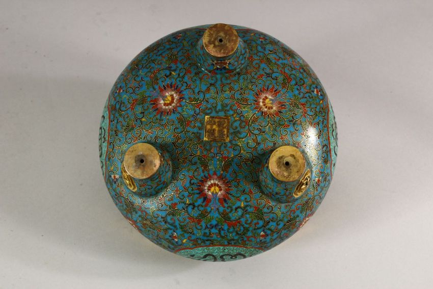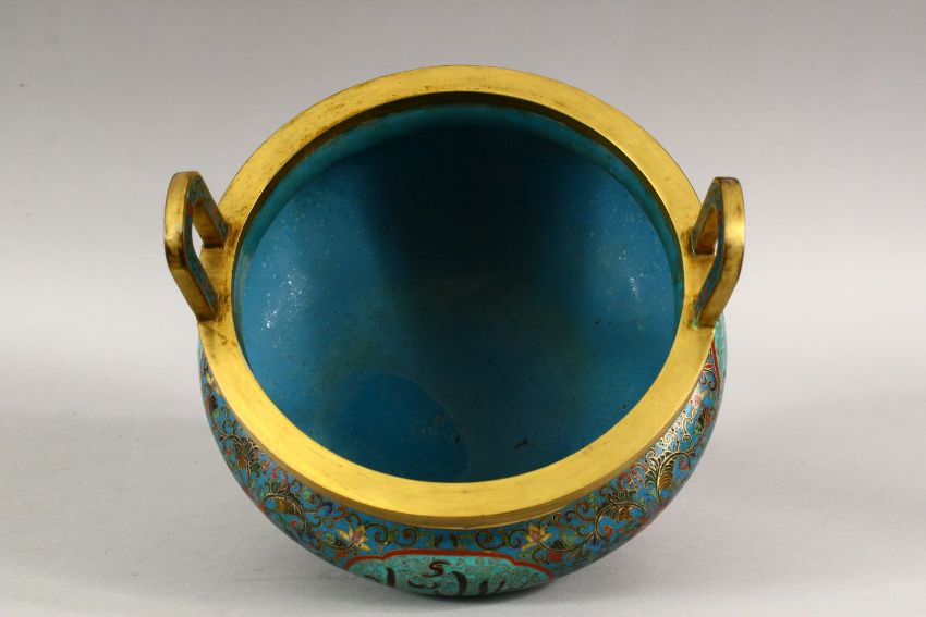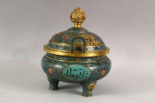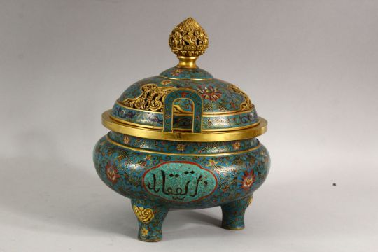 A VERY GOOD CHINESE CLOISONNE ENAMEL TWO HANDLE KORO AND COVER, made for the Islamic market, supported on three feet, 24cm high, 19cm diameter.