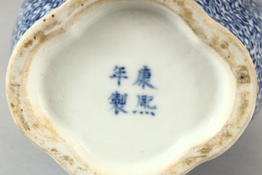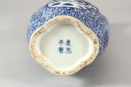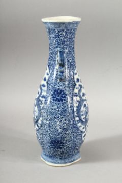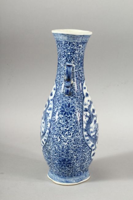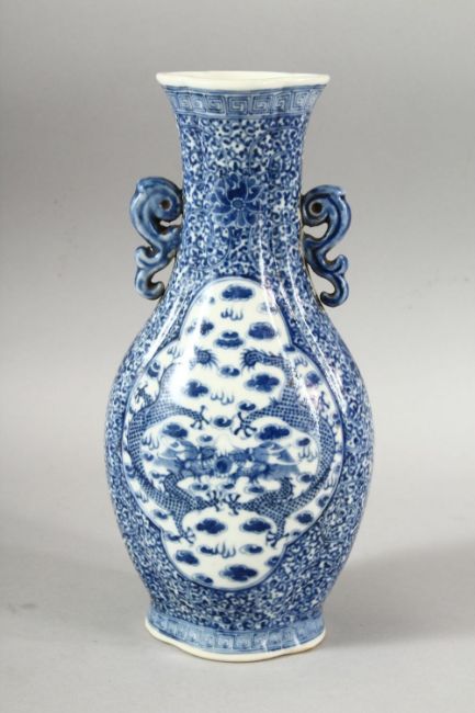 A CHINESE BLUE & WHITE PORCELAIN TWIN HANDLE VASE, decorated with panels of dragons and clouds upon a floral ground, with twin handles, the base with a four character mark, 25cm
