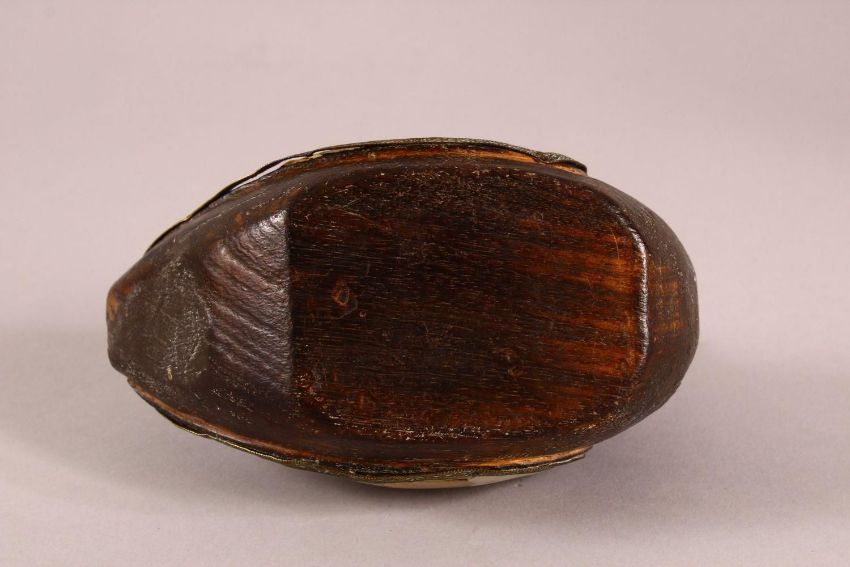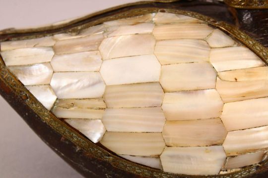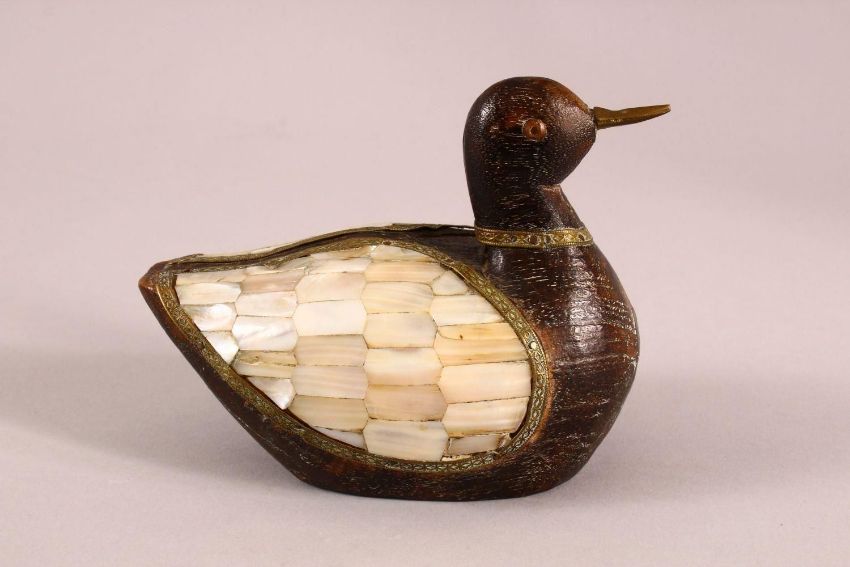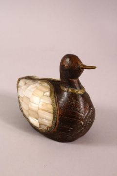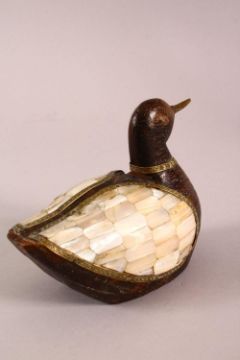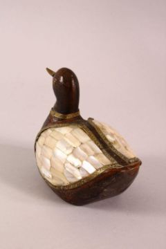 A 19TH / 20TH CENTURY INDIAN CARVED WOOD & MOTHER OF PEARL INLAID MODEL OF A DUCK, 15cm wide.