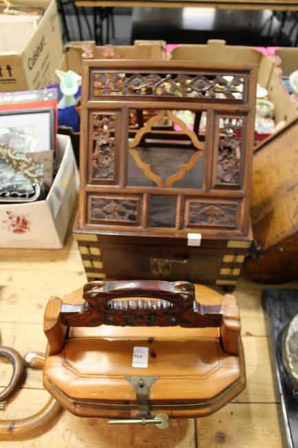 A Chinese wooden sewing basket and a table top box with folding stand.