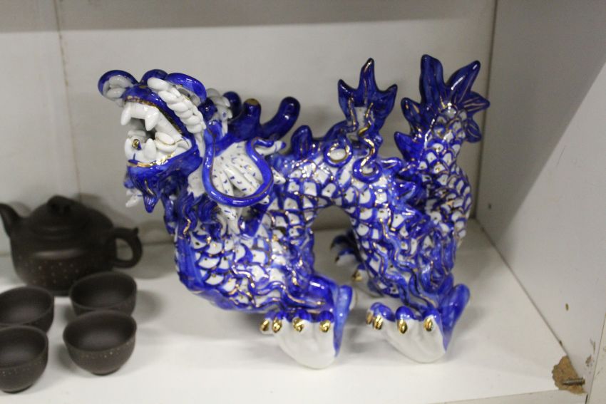 A Chinese gilt and blue decorated model of a lion together with other oriental porcelain.