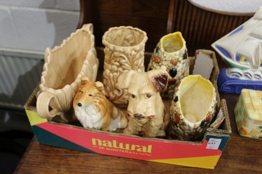 Sylvac dogs and other china together with a porcelain model of a sailing ship and a butter dish and cover.