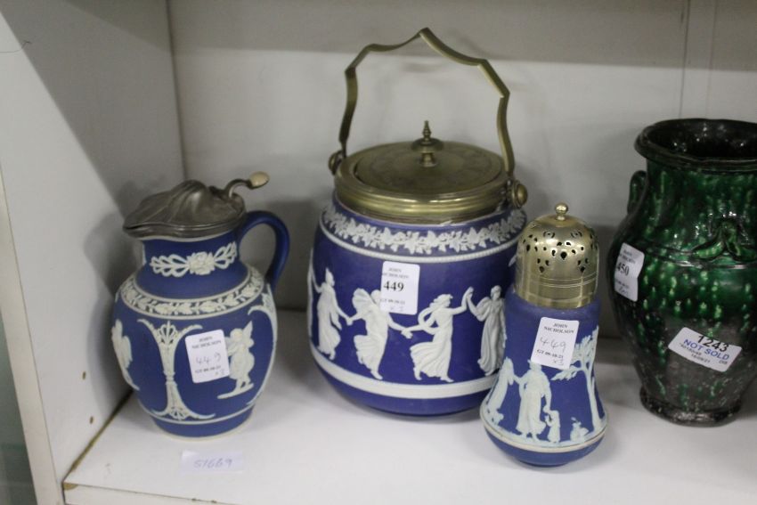 A Jasper ware biscuit barrel, jug and sugar sifter.