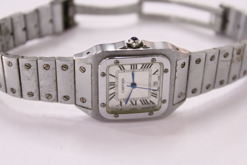 A stainless steel wristwatch.