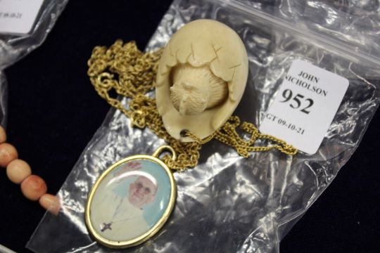 Two decorative pendants and chains.