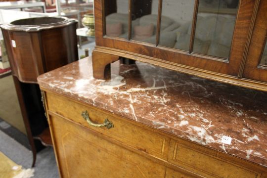 A 19th century French marble top burr wood side cabinet with a pair of frieze drawers over two doors on a plinth base.