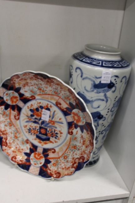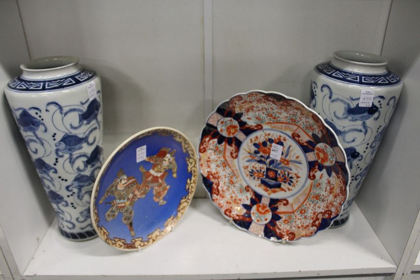 A large Imari dish, a Satsuma dish and a pair of modern Chinese blue and white vases.
