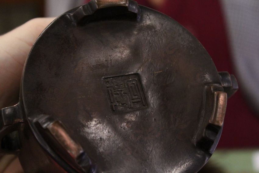 A Chinese bronze twin handled circular censer.