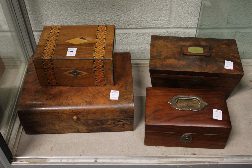 Four various 19th century and later boxes to include a mahogany sarcophagus shaped tea caddy converted to a jewellery box .