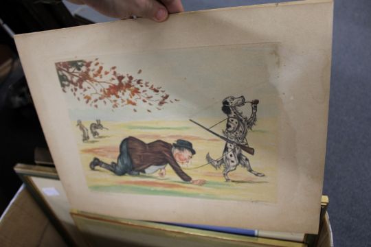 A box of paintings and prints.