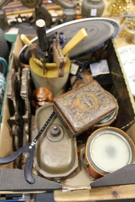 Miscellaneous collectables to include soda syphons, drum shaped storage boxes etc.