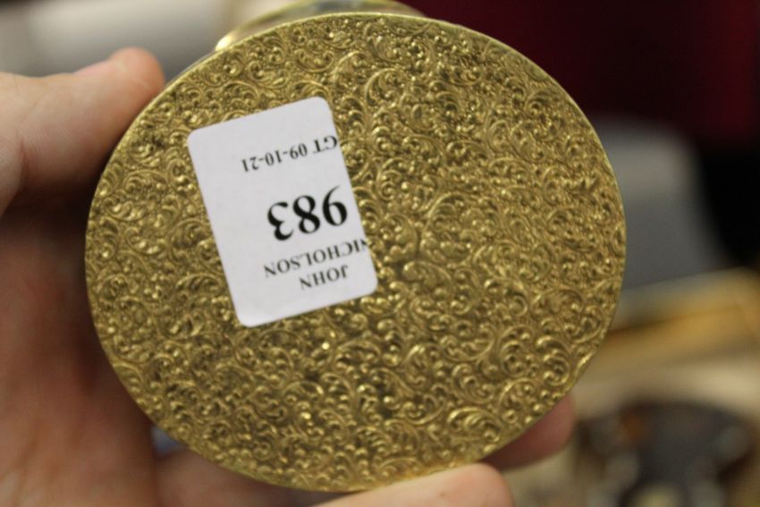 A decorative gilt metal and enamel box with portrait miniature cover (lacking inset stones).