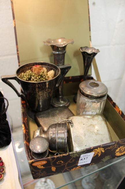 A silver twin handled cup, bud vases, cigarette cases etc.