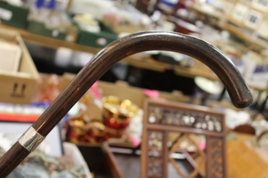 A walking stick with silver collar.