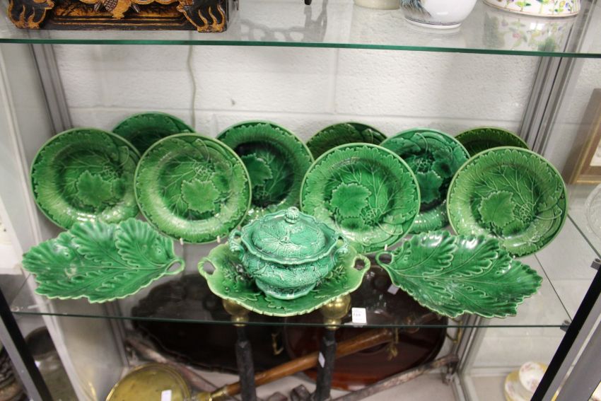 A good collection of Wedgwood and similar cabbage leaf and oak leaf serving dishes and small tureen and cover.
