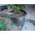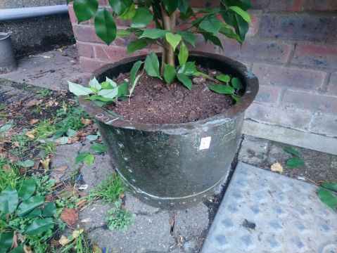 Two old copper pots containing artificial plants.