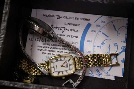 A small collection of gold and other rings, two ladies' wristwatches, an evening purse etc.