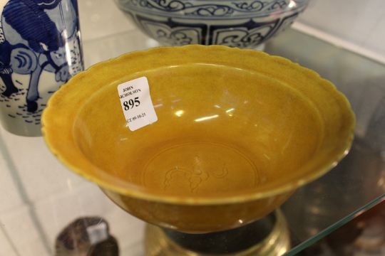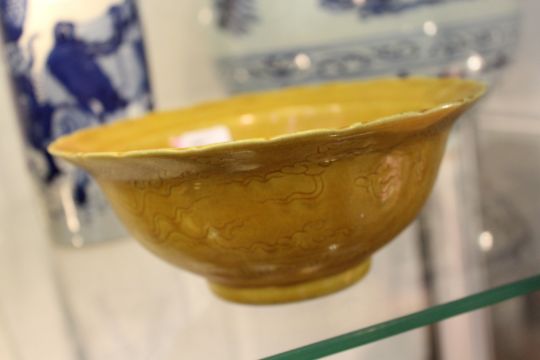 A Chinese gold ground circular porcelain bowl with incised decoration.