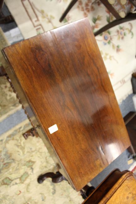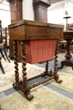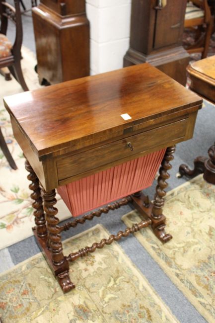 A 19th century rosewood work table with foldover rectangular top, single frieze drawer, a pull-out bag to the underneath, supported on barley twist legs and stretchers.