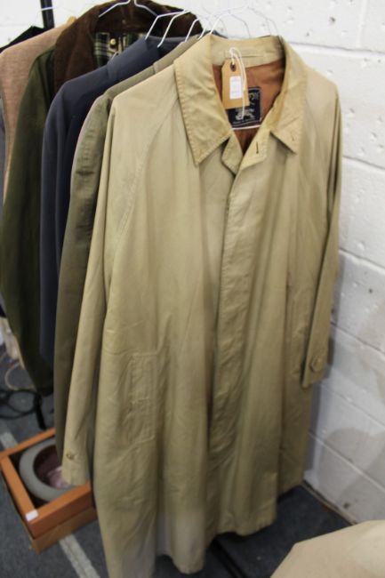 A gentlemen's classic Burberry beige raincoat and a similar coat.