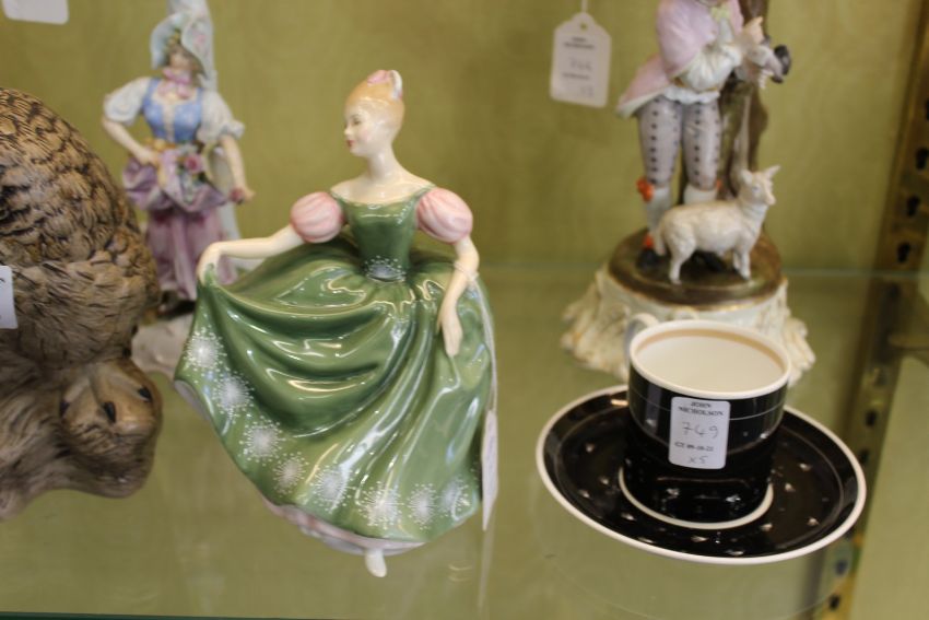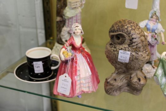 A pair of Susie Cooper coffee cups and saucers, a Royal Doulton figurine "Janet" and another "Michelle" together with a Poole Pottery owl.