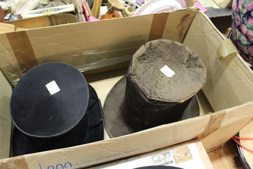 Two bowler hats and three top hats, some with boxes.