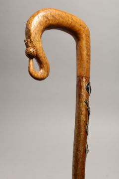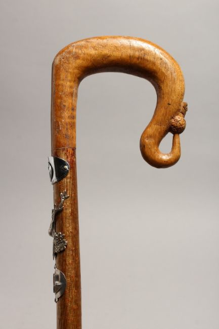 A SCOTTISH WALKING STICK with thistle handle and mounted with emblems