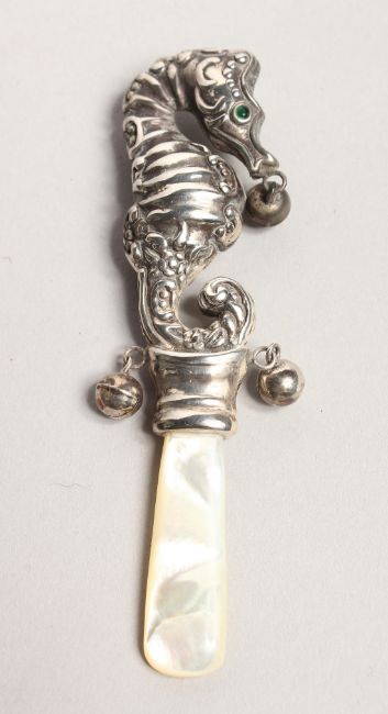 A BABY'S SEA HORSE AND MOTHER OF PEARL RATTLE