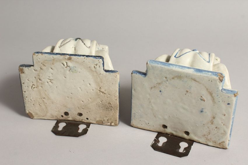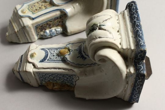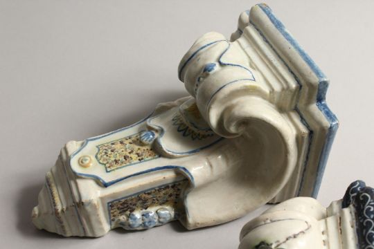 A PAIR OF MAJOLICA BRACKETS with painted decoration.