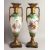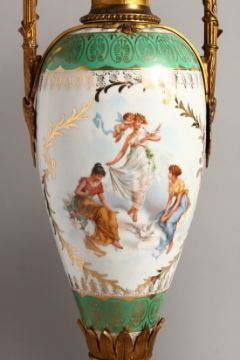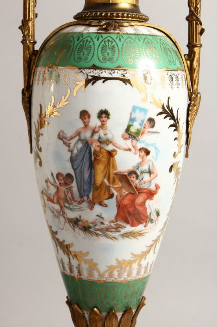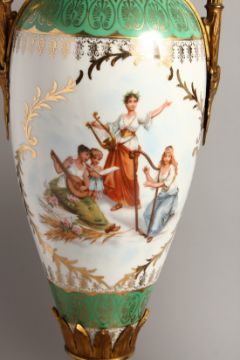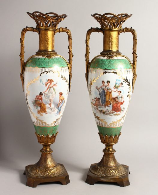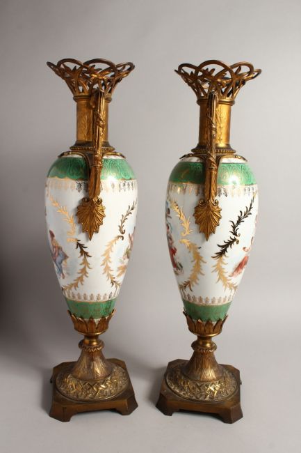 A TALL PAIR OF 19TH CENTURY CONTINENTAL PORCELAIN TWO HANDLED SLENDER VASES with reverse scenes of classical female figures with masks and bows