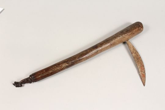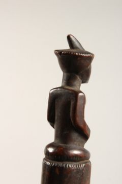 A TRIBAL WOODEN AXE carved with a figure. 23.5ins long