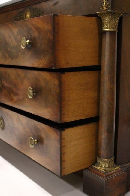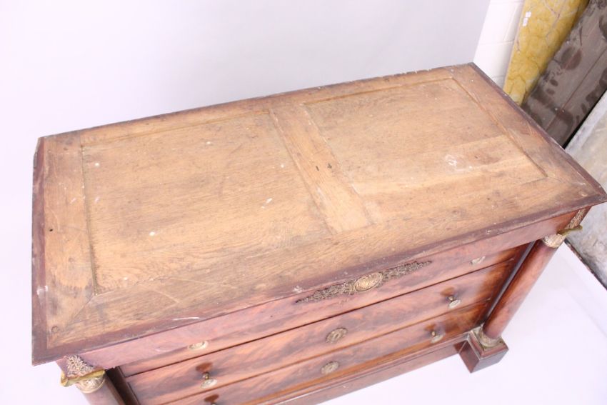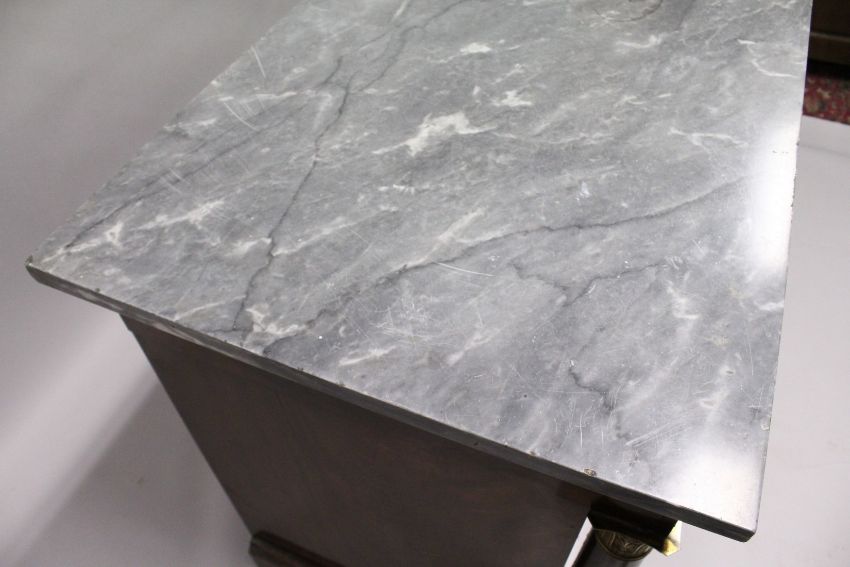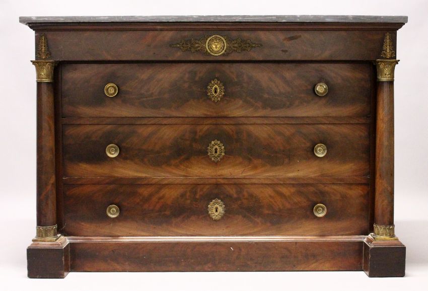 A GOOD 19TH CENTURY FRENCH MAHOGANY, ORMOLU AND MARBLE COMMODE, with a grey veined rectangular marble top, a frieze drawer, above three graduated long drawers, flanked by turned columns with brass capitals, on a shaped platform base.