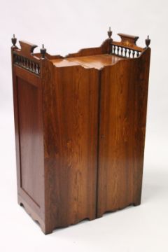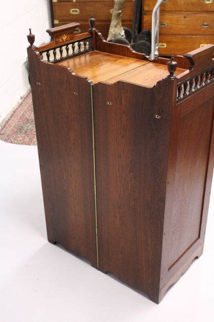 A RARE 19TH CENTURY ROSEWOOD INLAID FOLDING CAMPAIGN CUPBOARD, opening to reveal six free-sliding drawers each side, with satinwood inlay, and bobbin turned finials.