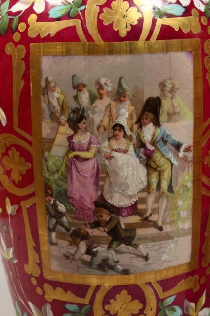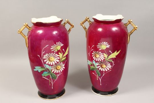 A LARGE PAIR OF 19TH CENTURY FRENCH PORCELAIN TWO HANDLED VASES painted with a panel of figures and flowers.