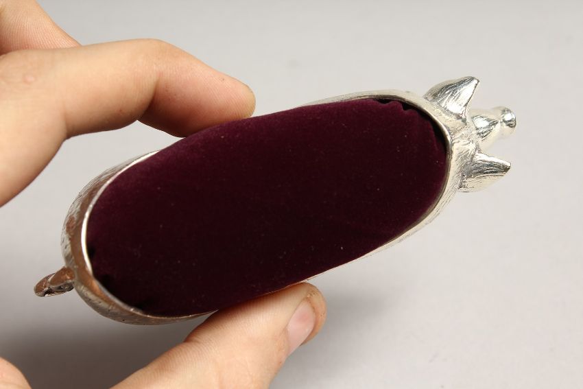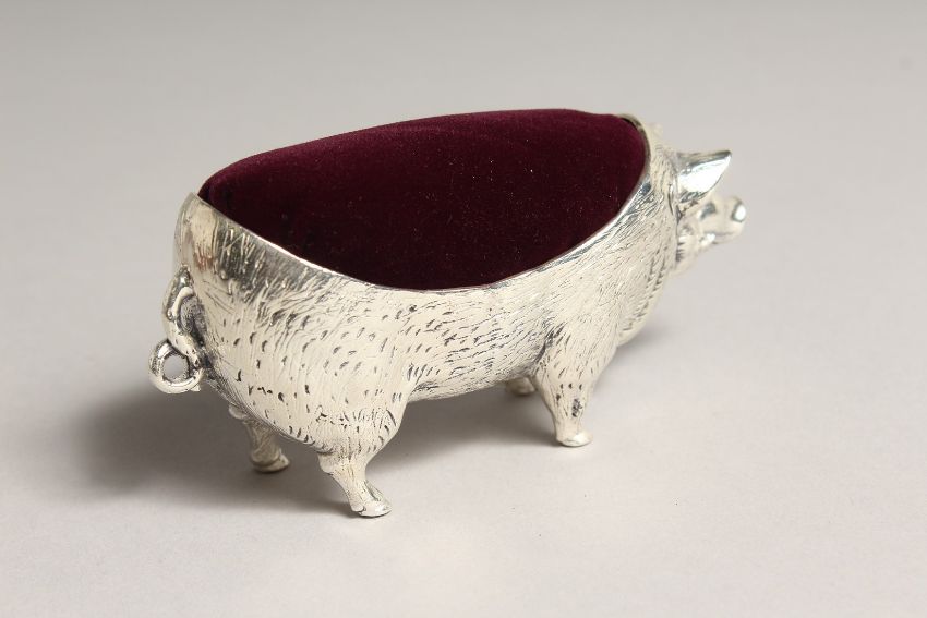A LARGE SILVER PLATED PIG PIN CUSHION