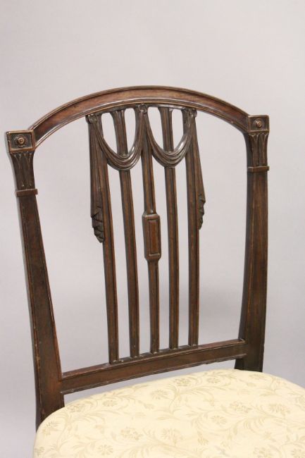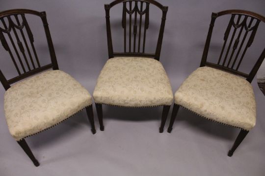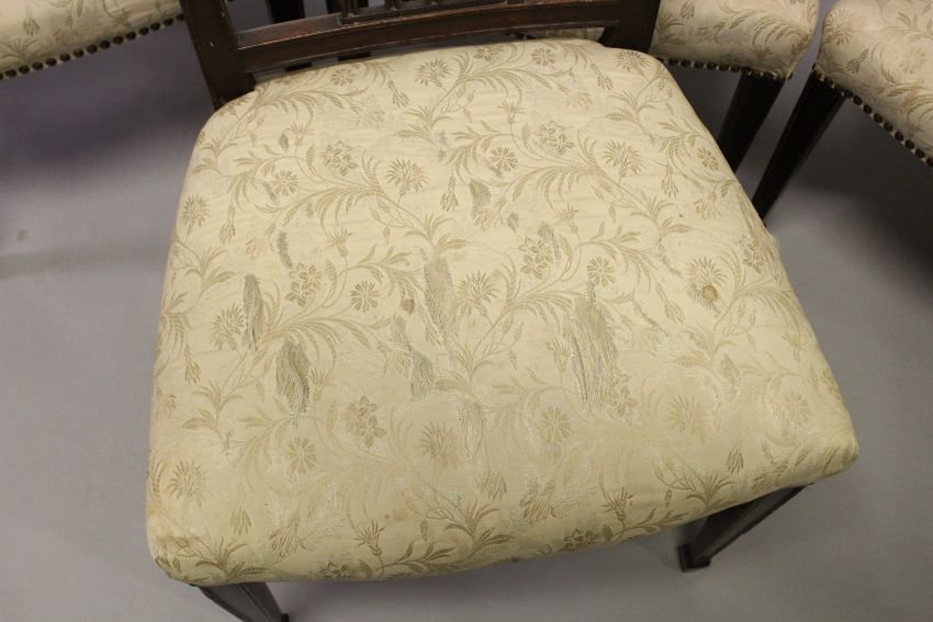 A SET OF FOUR HEPPLEWHITE DESIGN MAHOGANY DINING CHAIRS, with arched top, carved vertical tie bars, overstuffed seats on tapering square legs with spade feet. (4).