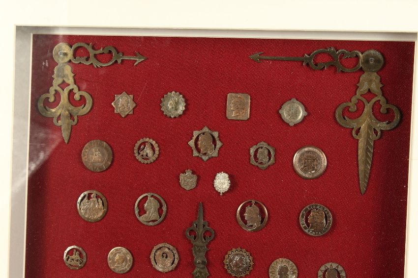 A COLLECTION OF FRAMED COINS, TIE PINS, BUTTONS, MEDALLIONS, AND CLOCK HANDS
