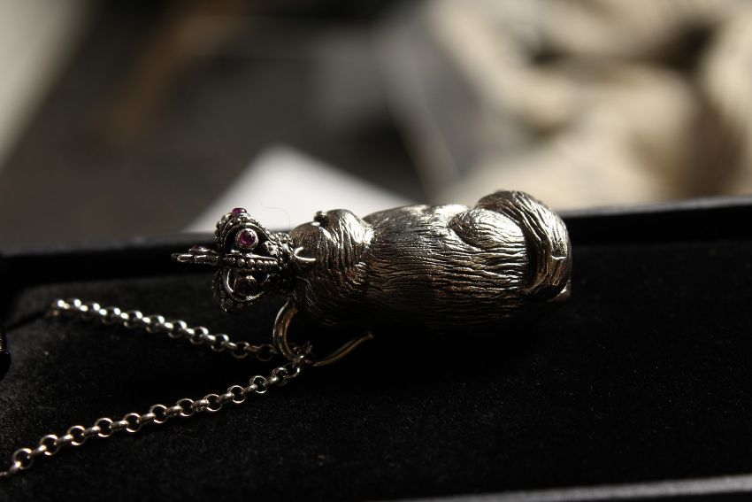 A SILVER ROYAL CAT, WITH CROWN, PENDANT on a chain