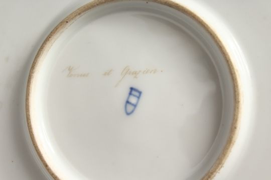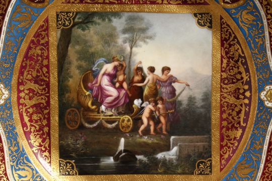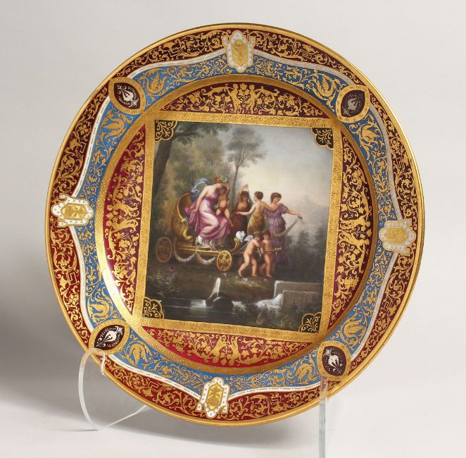 A SUPERB 19TH CENTURY VIENNA CIRCULAR DISH with high quality painting and gilding, the centre with classical female figures, chariot and cupids.