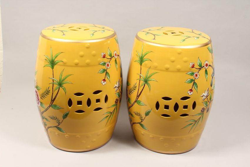 A PAIR OF CHINESE PORCELAIN BARREL SEATS, yellow ground, decorated with birds on flowering branches