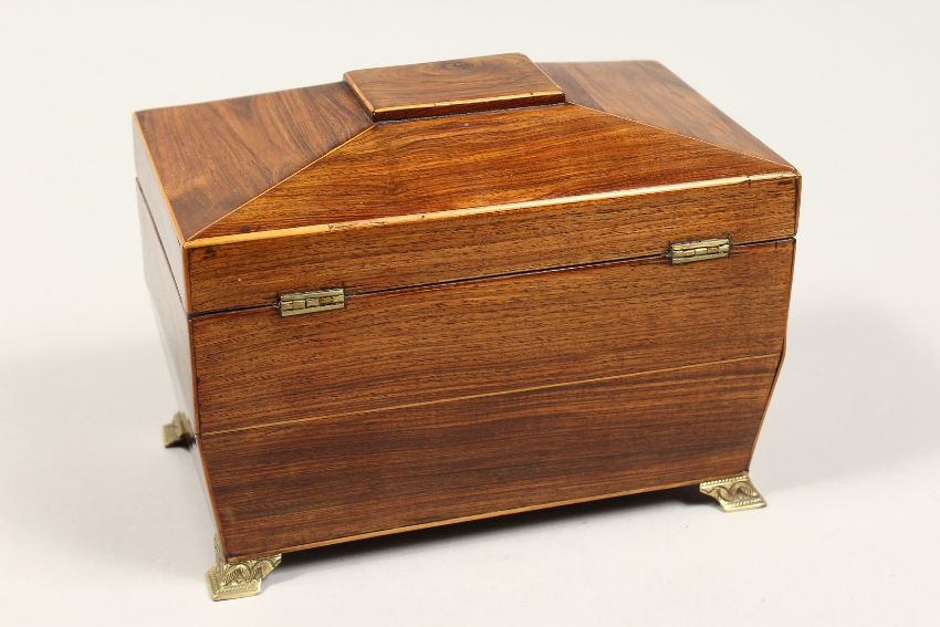 A REGENCY ROSEWOOD DOMED TOP TWO DIVISION TEA CADDY with iron escutcheon on brass bracket feet.