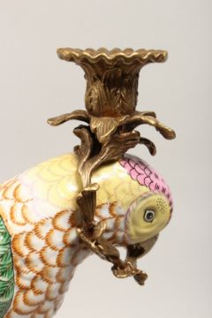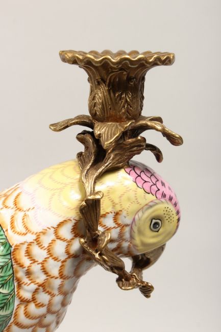 A PAIR OF DECORATIVE PORCELAIN AND ORMOLU CANDLESTICKS, modelled as parrots on tree stumps