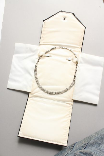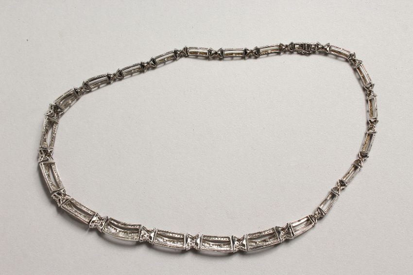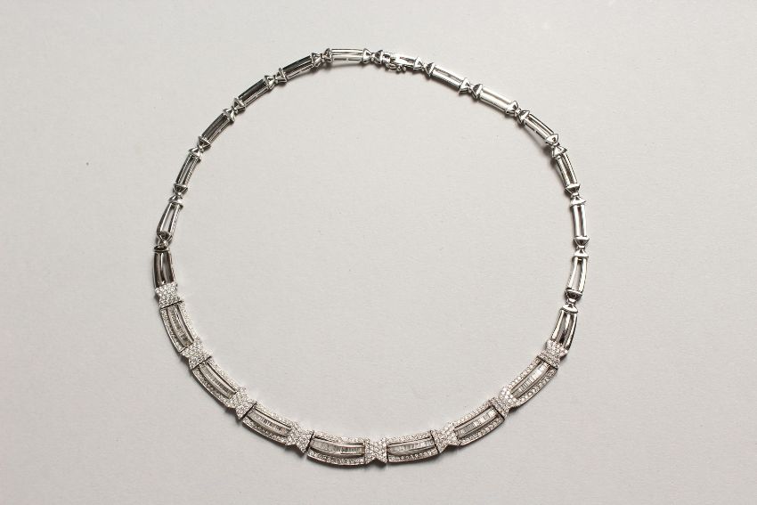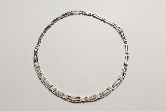 AN 18CT WHITE GOLD AND DIAMOND TRIPLE ROW NECKLACE in folding leather case.